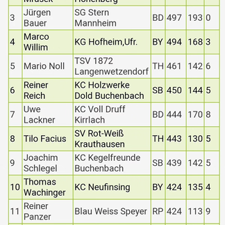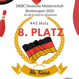 Unser Vereinsmitglied Tilo Facius hat am vergangenen Wochenende vom 06.-08.10.2023 in Weinheim an den DKBC Deutsche Meisterschaft Breitensport teilgenommen und den 8. Platz mit 443 Holz erreicht. Das ist ein phantastisches Ergebnis für ihn, den Verein und die Region.